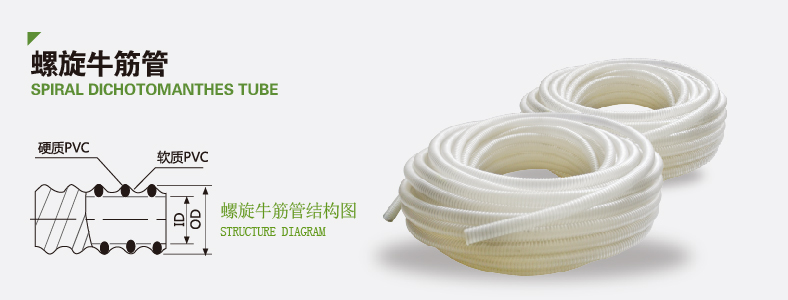 螺旋牛筋管主要用于園林、工廠(chǎng)和水利土木工程上的真空抽吸粉料、顆粒、抽吸輸送水、油等,同時(shí)是橡膠管、金屬管的優(yōu)良替代品。具有質(zhì)輕、透明、彎曲半徑小,成本低廉,耐候性佳、占用空間小的特點(diǎn)。